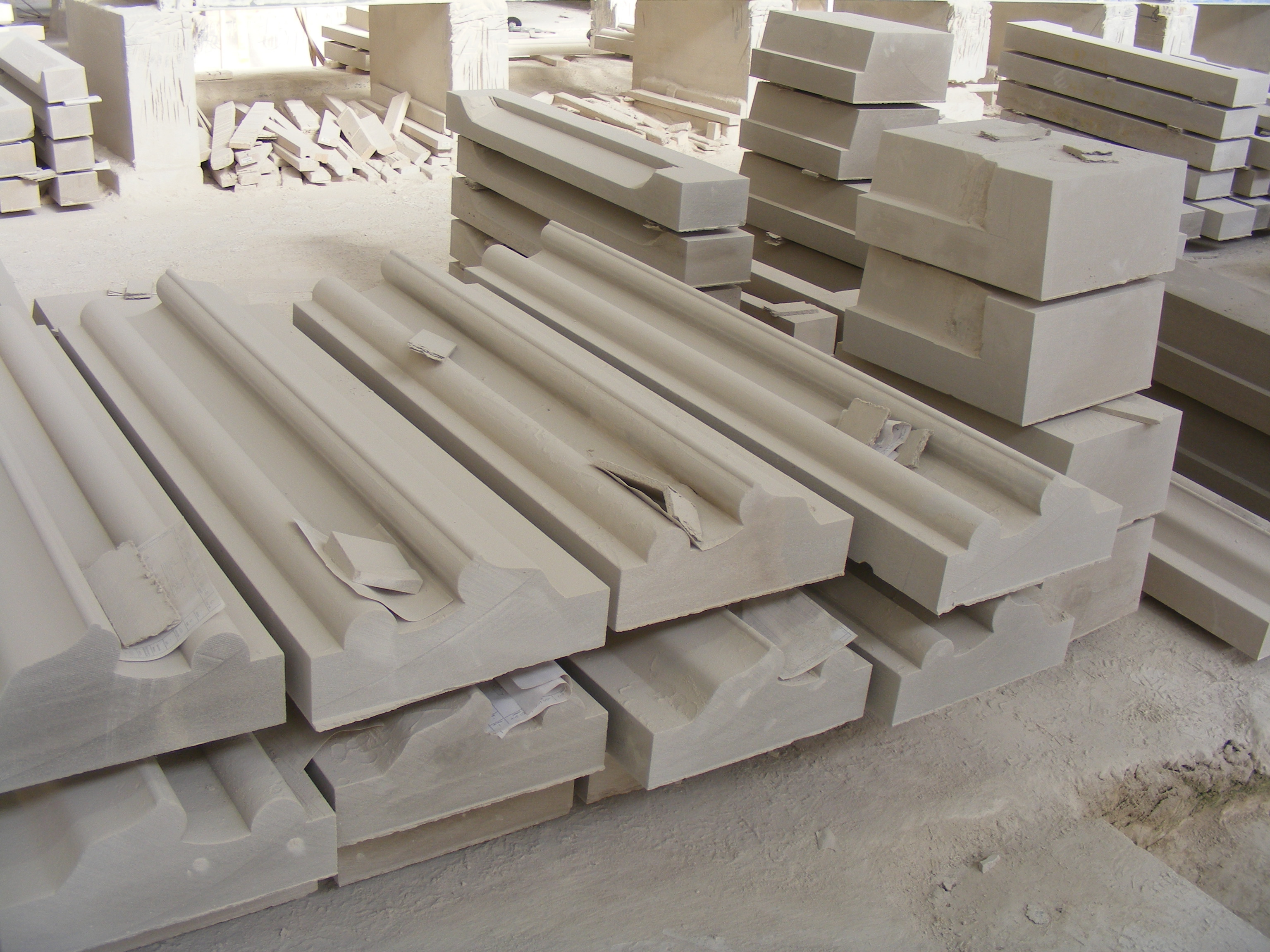 Limestone is not an off-the-shelf material like standard units of lumber, brick, or steel; each and every piece is custom-carved for a specific job. Each job therefore, becomes a jigsaw puzzle of stone pieces, each of which is destined for a specific spot on a building. We sometimes think of this much like fabricating millwork: material can be sawn, either across or with the grain, it can be planed, and it can be cut with specially profiled knives into a variety of decorative shapes, much like moldings are in wood. The difference, of course, is in the heaviness and robustness of the tools used; most knives are encrusted with industrial grade diamonds and water is frequently used to mitigate the high amounts of friction generated.