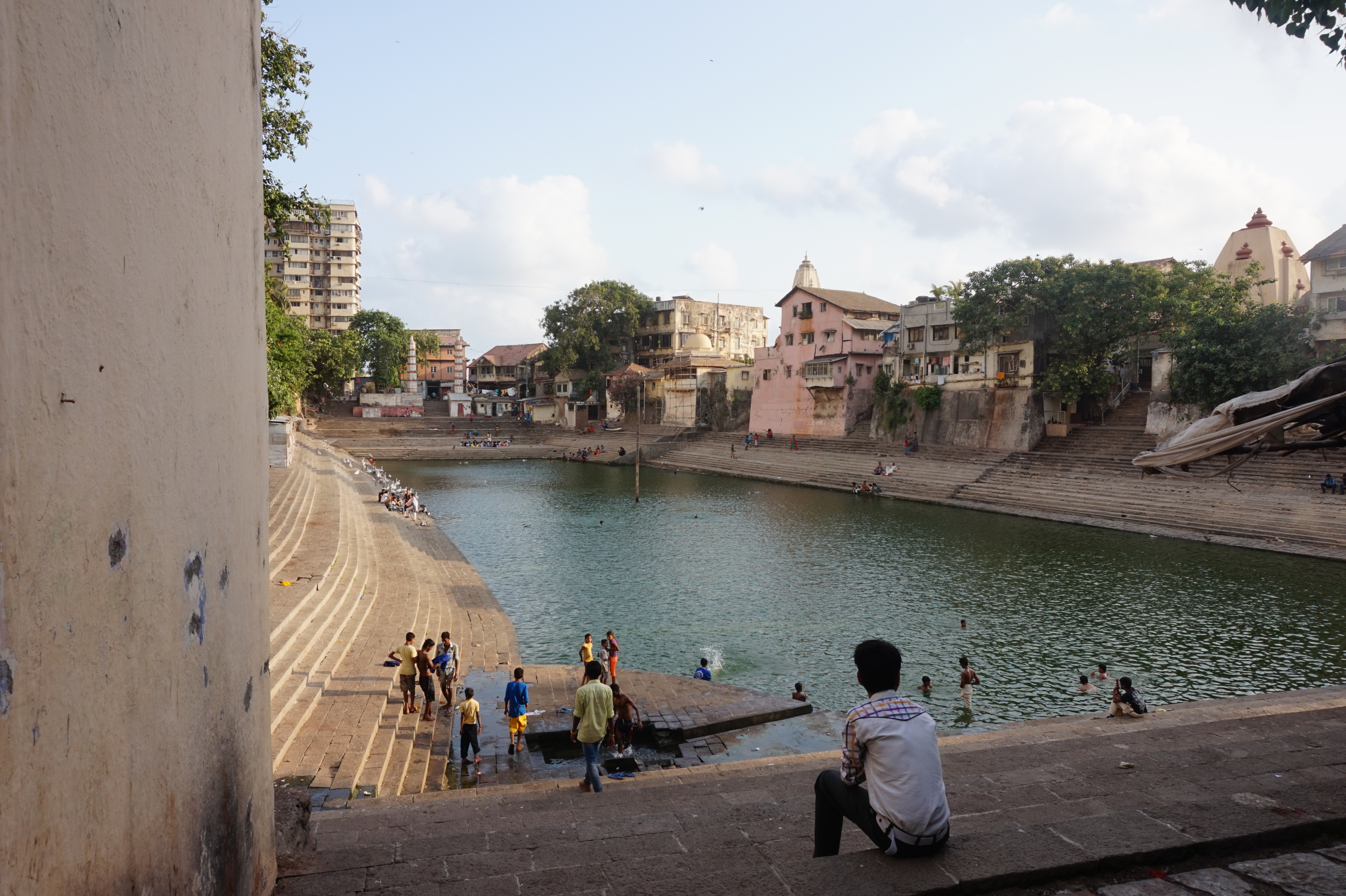Banganga Tank is a place that can be difficult to find without the help of a local resident of Mumbai. This sacred place is a peaceful oasis and water sanctuary in the middle of the bustling megalopolis. It is a place of worship with a rich historical and religious heritage and is a pilgrimage site for Hindus. According to Hindu myths, the god Rama shot an arrow that pierced the ground and yielded fresh water. Geographically the site is located on top of a freshwater spring. The tank, and specifically its water, have been known to have healing and purifying qualities and can be used for ritual bathing. Beautiful ancient stone carvings can be found in subtle locations, carved into the side of the wall. Steps descend into the sacred water tank on all four sides and reveal traces of past water levels through their time-stained discoloration.